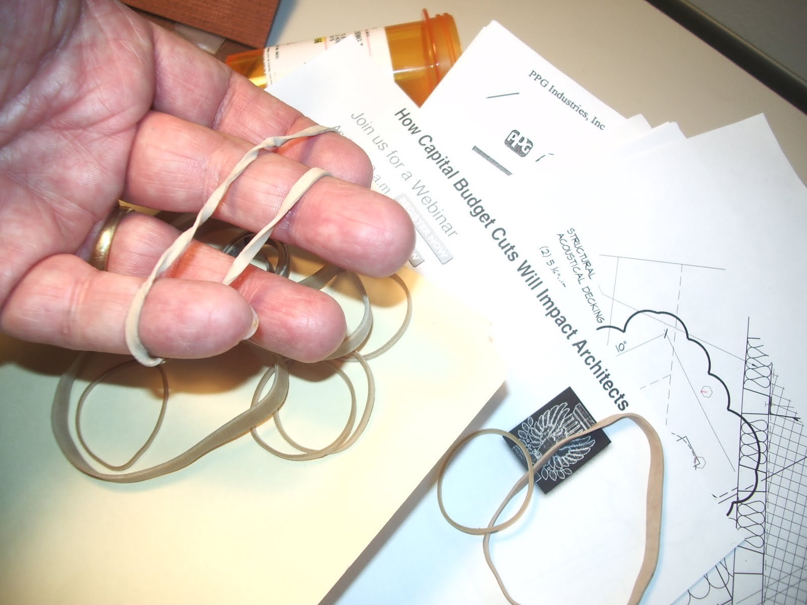 I’ve got lots of rubber bands nowadays. Our architect business is down to the nubs and we don’t have any plans to roll up and secure with a rubber band. They have other uses though. They held up our plants until they all died. You can use them to keep the sole of your shoe from flapping. And you can use them instead of expensive file folders to hold repossession and past due notices together so you don’t lose them. They can even serve as a fastener for button less jeans.